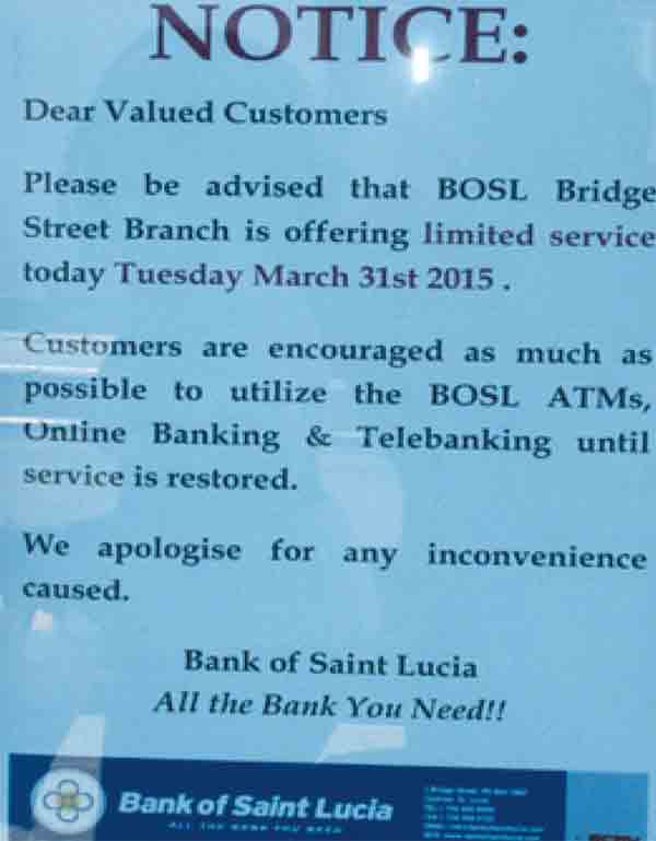 ![A notice posted on BOSL's Castries Waterfront branch which was closed last Tuesday. [Photo: Stan Bishop]](https://www.thevoiceslu.com/wp-content/uploads/2015/04/bosl-notice.jpg)