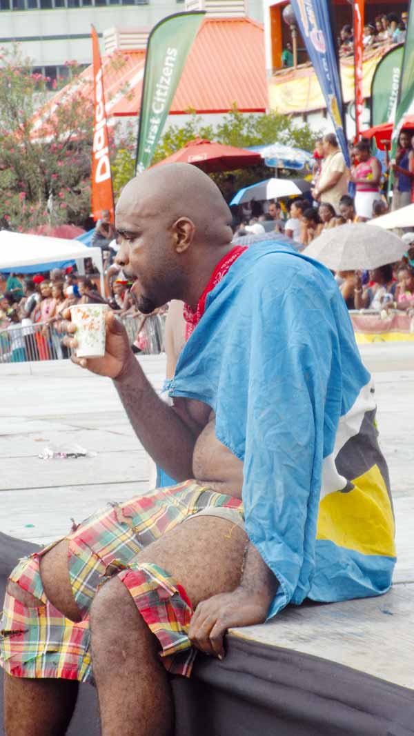 Donning the St. Lucian flag in a rather disrespectful manner and with dishevelled clothing, this man could barely find his footing and his inability to even stay seated up straight on the judging platform was a clear sign that something, maybe in his drink, had its toll on him.