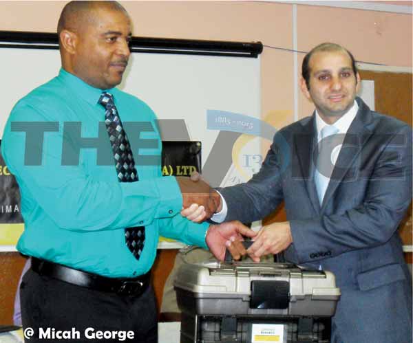 On picture Desir (L) receiving the kit from Dr. Aboud of Caribbean Forensic Services of which he is their Forensic Lab Director.