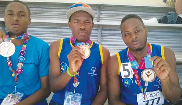 (L-R) Medal winners Benwick Winifred, Joshua Henry and Nordy Randy Gilbert. [Photo: ASt. Lucia Special Olympics]St. Lucia’s Medal count continued with Benvick Winifred capturing the Bronze Medal in Division 39 with a time of 29.72 seconds while Nody Randy Gilbert, after suffering a mishap at the starting blocks, was able to have a close finish at the line placing second and capturing the Silver Medal in Division 43 in a time of 24.53 seconds.