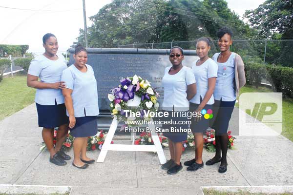 SALCC students pose near Sir Arthur’s tomb yesterday. [PHOTO: Stan Bishop]Among those laying wreaths at Sir Arthur’s tomb yesterday were Governor-General Dame Pearlette Louisy; Sir Arthur’s nephew and former Prime Minister, Dr. Vaughan Lewis; Chairperson of the Board of Governors, Fortuna Anthony; Gaspard Henry, Secretary of Staff Association, CordeliaFevrier; and President of the Students’ Council, ChaddieFaucher.