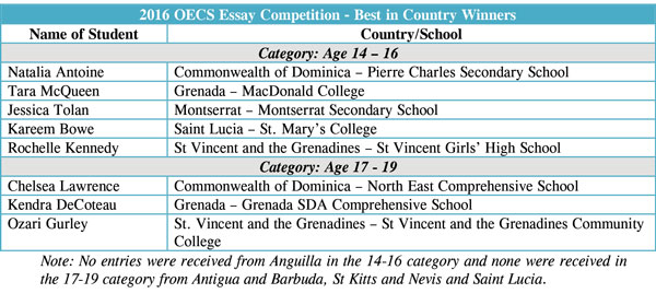 One hundred and fifty-six (156) entries were received from 25 schools across the OECS. The essays were assessed for content, soundness of points, logical development, knowledge of the subject, command of language and presentation.