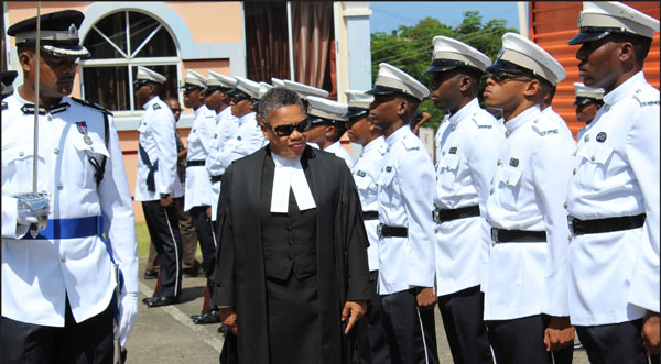 DAME Janice Pereira, Chief Justice of the Eastern Caribbean Supreme Court, inspecting a Guard of Honour at the opening of the of the 2016/2017 law year on the grounds of the National Cultural Centre, Tuesday.