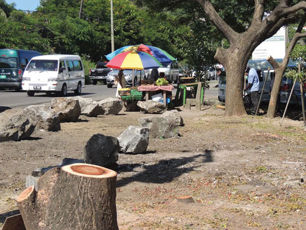 I was taking my usual trip to the supermarket last Saturday morning when a drastic change in the landscape opposite the Bay Gardens Hotel jolted me. As a drove closer, I realized one of the trees where the coconut vendors ply their trade had been cut and boulders placed along the roadside.