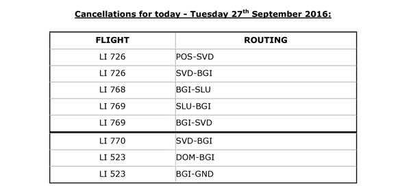ST. JOHN’S, Antigua – LIAT wishes to advise that due to the impending passage of a large area of disturbed weather affecting both the northern and southern Caribbean, it has been forced to cancel the following services today: