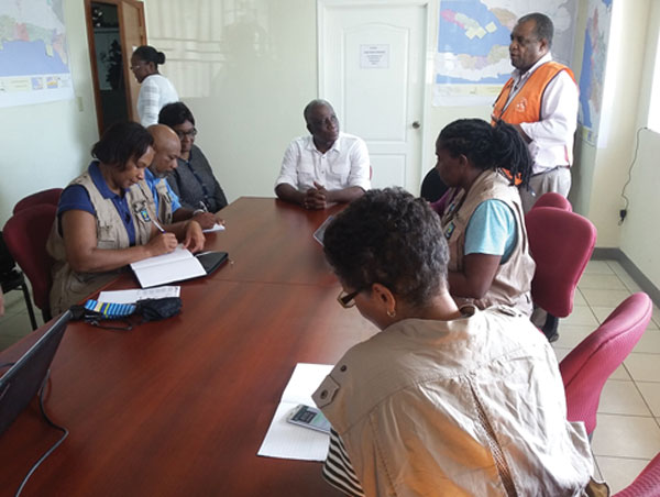 The experts are members of the CARICOM Operational Support Team (COST) and will provide support to coordination efforts in Jérémie and Les Cayes, two settlements most affected by Matthew. The team met with the Minister of the Interior and Territorial Communities, Francois Anick Joseph and Madame Jean Baptiste, Director of the CPD.