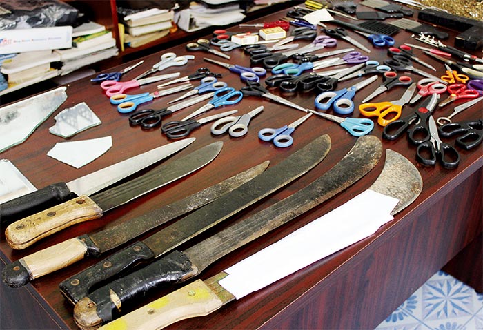 On display at the offices of the Community Relations Branch yesterday were 47 knives including penknives. One of those knives measured 12 inches in length. There were three knives measuring seven and a half inches, two measuring seven inches and two measuring six inches. Also on display were five cutlasses, 46 pairs of scissors, nine screw drivers and 14 lighters.