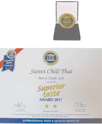 PRESS RELEASE – BARON Foods has once again been honoured with two Gold Stars at the Superior Taste Award for its Sweet Chili Thai Sauce product from the International Taste and Quality Institute (iTQi).