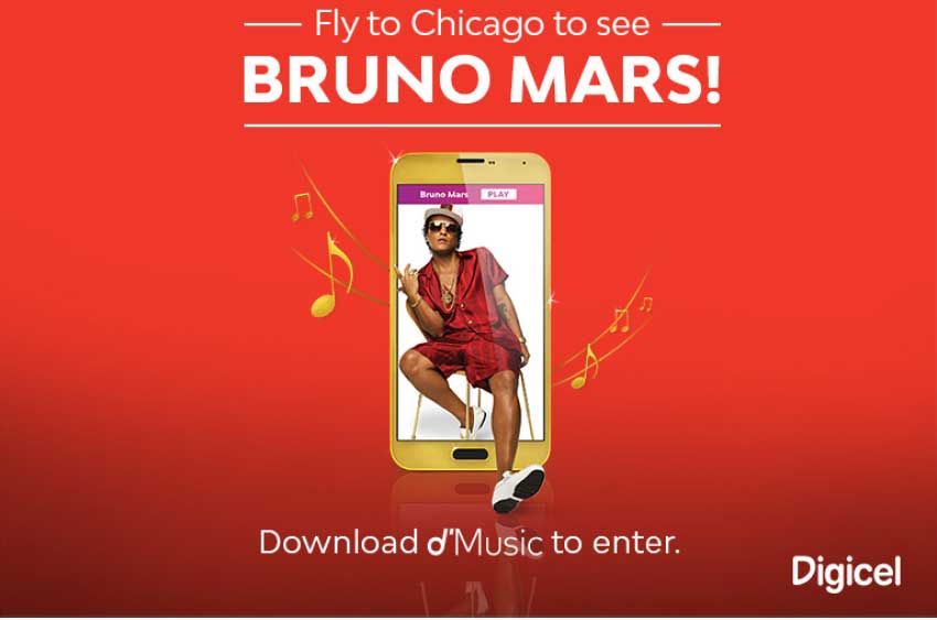 PRESS RELEASE – DIGICEL has announced that five lucky customers will get a chance to jet off on a VIP experience to see Bruno Mars live in concert during his 24K Magic World Tour at the United Centre in Chicago on Saturday, August 19 – thanks to its d’Music streaming app.