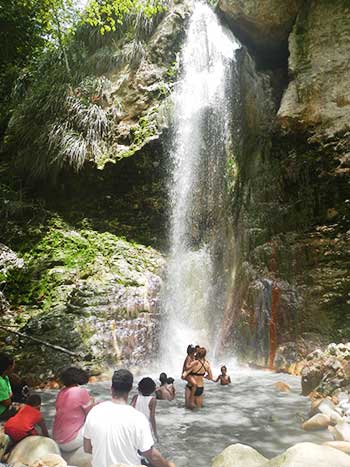 Some reclined against the rock face in the gentler force of water slithering down. Others, joined us, face and arms smeared in black sulphuric mud and wallowed in the therapeutic bath. One woman in ecstasy, it seemed, took up residence under the warm torrent, reluctant to exit the pool for any reason.