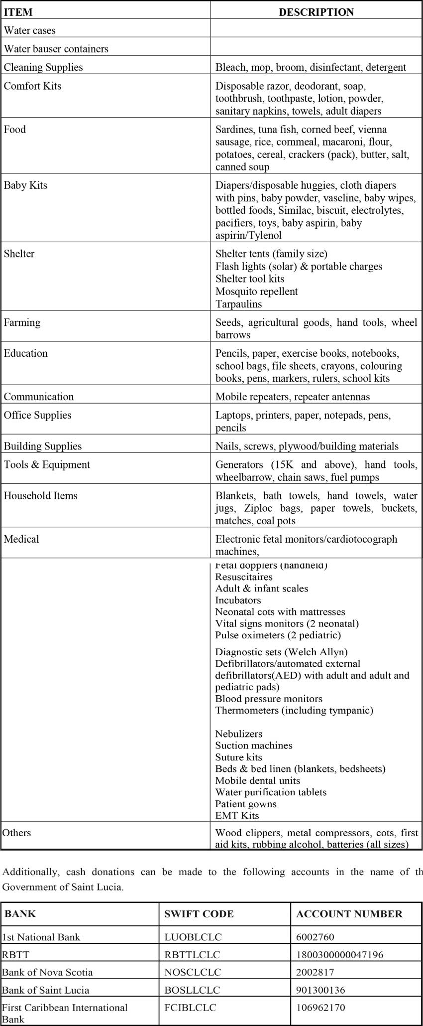 The Government of Saint Lucia and the OECS wish to thank everyone who has contributed to this worthy cause and encourage others to donate in accordance with the priority needs as identified by the affected states. Items can be delivered to any post office as well as the NEMO headquarters at Bisee, Castries.