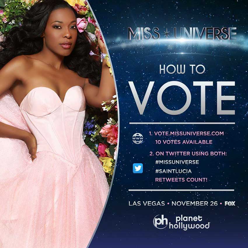From yesterday until Saturday, November 25, fans can vote for Louise Victor, who is Saint Lucia’s delegate at the 66th Miss Universe Pageant. Voting can be done in two ways: (1) Visit vote.missuniverse.com, login and follow the instructions to vote. There is a limit of ten (10) votes per account per day via this method during the voting period. You must click on the “Confirm Votes” button for your votes to be counted; and (2) Twitter: Submit a tweet or a retweet with #MissUniverse and #saintlucia. You must have a public Twitter account for your tweets and retweets to be counted. There is a limit of one hundred (100) votes per account per day (retweets included) via this method during the voting period.