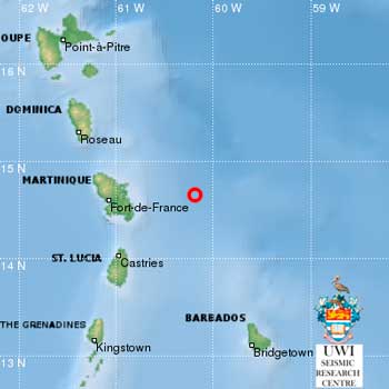 The earthquake occurred at latitude 14.65 N and 60.19 W at a depth of 10 km.