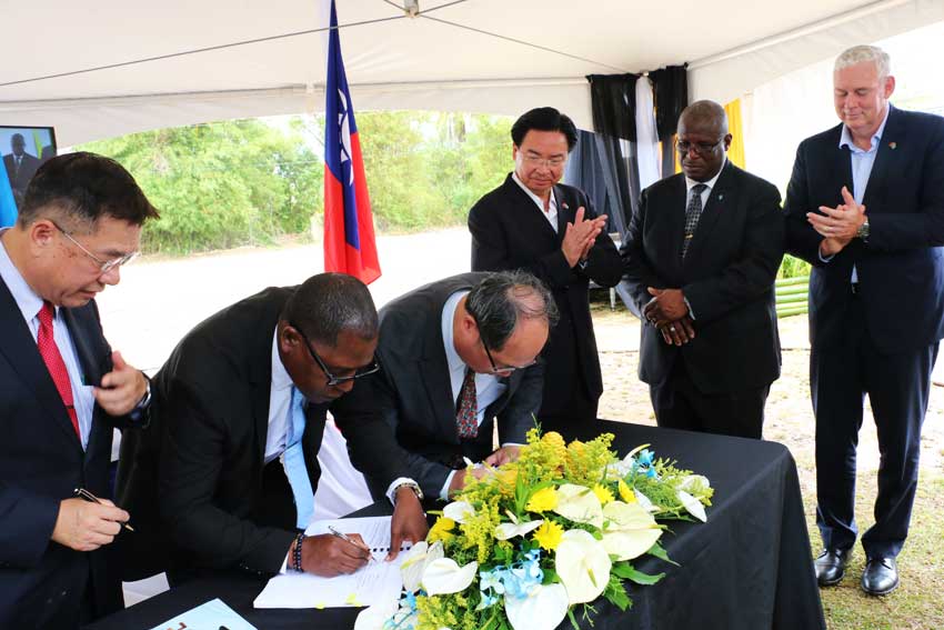 The delegation subsequently attended the construction contract signing and sod-turning ceremony for the National Road Improvement and Maintenance Programme in Saltibus. Minister Wu said during a speech that mutually beneficial cooperation is the foundation of Taiwan-Saint Lucia relationship and Taiwan is proud to support such a vital project. Minister Wu, Prime Minister Chastanet and the Honourable Stephenson King, Minister for Infrastructure, Ports, Energy and Labour, then witnessed the signing of the construction contract between the Ministry of infrastructure and Taiwan’s Overseas Engineering and Construction Company (OECC).
