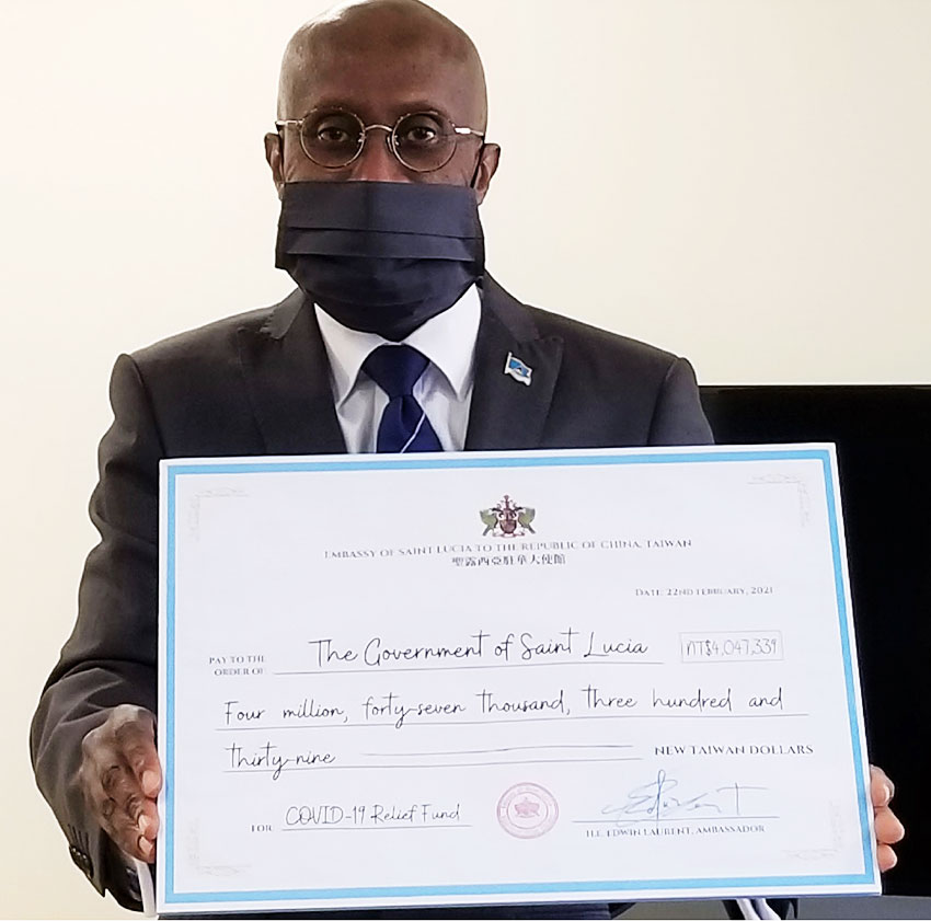 Prior to the ceremony, Ambassador Edwin Laurent met with the Ministry’s representatives, and the Chairman of the St. Lucia Friendship Alliance to announce the total proceeds from the Embassy’s initiative for securing assistance from the general public in Taiwan to aid Saint Lucia’s COVID-19 relief and recovery efforts. The Embassy was able to obtain donations of surgical masks, test kits, disposable coveralls, hand gloves, N95 masks, PPE and other items. In addition, a total of NT$4,047,339 (approximately EC$391,700) was raised for the COVID-19 Relief Fund which will be sent to Saint Lucia.
