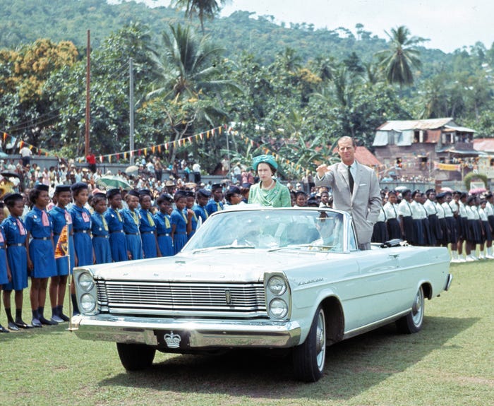 Britain’s Queen Elizabeth II and her husband Prince Philip are driven towards a children’s rally in St. Lucia, in February 1966. AP Photo