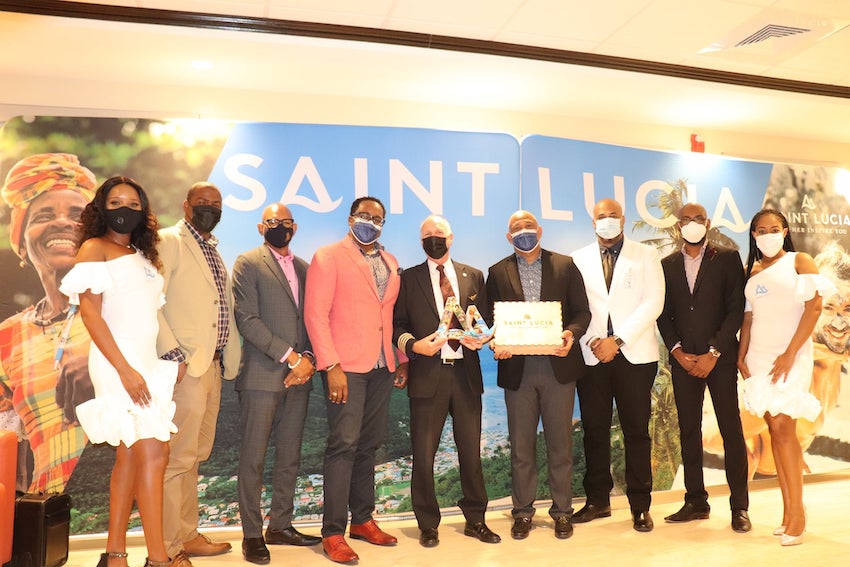 VS221 touched down, bringing 148 travellers to a warm welcome from the Saint Lucian Government, represented by the Minister for Tourism, Hon. Dr. Ernest Hilaire. Also present were Mr. Thaddeus M. Antoine, Chairman of the SLTA, Mr. Paul Collymore, President of the St. Lucia Hospitality and Tourism Association, Gasper George, Corporate Communications Manager at the St. Lucia Air and Sea Ports Authority and Rondel Charley, Public Relations Officer at the Saint Lucia Tourism Authority.