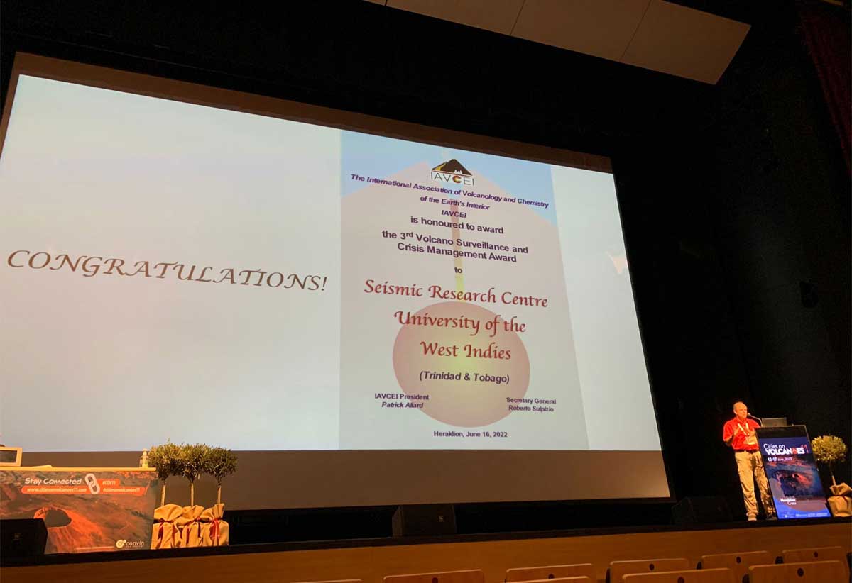 High commendation was bestowed on The University of the West Indies (The UWI) from the world’s leading global volcanological association. The regional University’s Seismic Research Centre (UWI SRC), located at the St. Augustine Campus, was announced as winner of the 2022 Volcanic Surveillance and Crisis Management Award presented by the International Association of Volcanology and Chemistry of the Earth’s Interior (IAVCEI) on Thursday, June 16. Director of the UWI SRC, Dr. Erouscilla Joseph accepted the award in Heraklion, Greece during the Association’s 11th Cities on Volcanoes Conference (COV11).