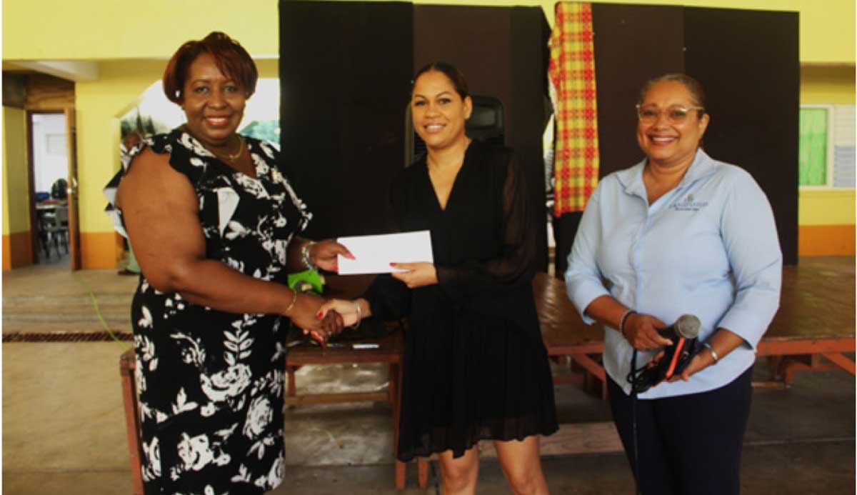 During a general assembly at the Union-based school on Friday, December 2, Shellone Surage, Legal and Compliance Officer at The Landings, presented a cheque for EC$5,000.00 to the school’s principal, Ethelene Leonce.