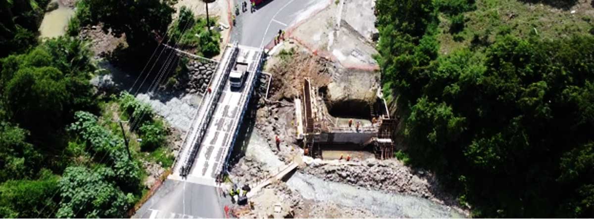 O.B. Sadoo’s Construction Manager, Marvin Williams asserts, “The project is the construction of a composite bridge, which is a steel frame with a concrete deck. The bridge is a 25-metre-long double lane bridge which is supposed to replace the single land bailey bridge which has been existing in that location for a while. The new bridge is approximately 1.6 metres higher than the original bridge was and that is to provide greater protection from rising water levels which is what affected the last bridge. This bridge is expected to be much more resilient to the environmental impact than the original bridge was.”