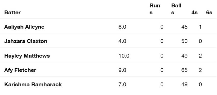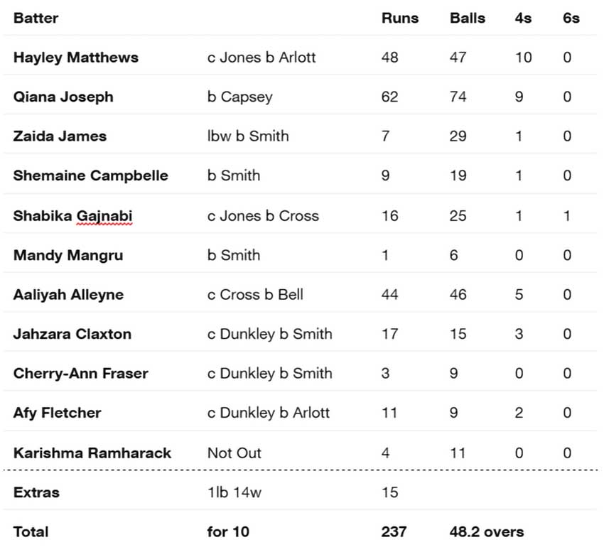 The West Indies started the run chase fairly well only to see the commencement of a collapse starting with the fall of the captain. Matthews scored 48 off 47 balls smashing 10 4s. Her opening partner, Qiana Joseph topped scored with 62 of 74 ball and featuring 9 4s.
