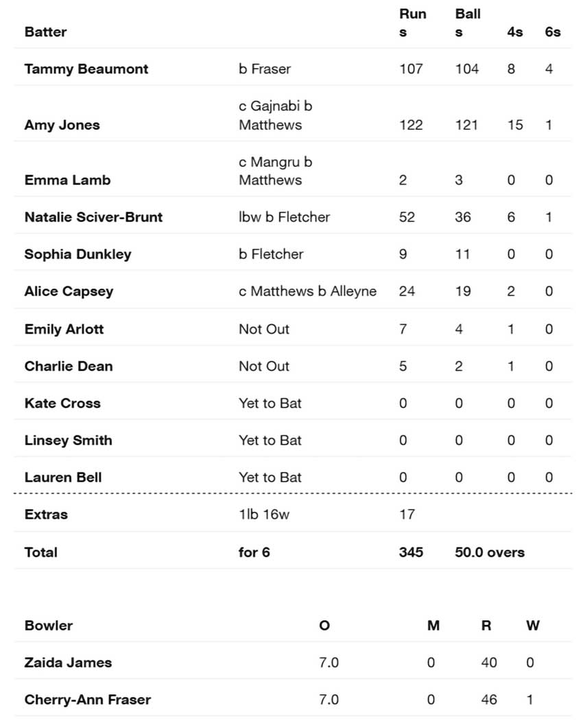 England won the toss and elected to bat first putting up what was always going to be a monumental task for the West Indies Women. Wicketkeeper and opening batter, Amy Jones, hit 15 4s and a solitary 6 on her way to 122 in 121 balls while Tammy Beaumont also scored a century in a 229 run partnership. Captain Nat Sciver-Brunt contributed a half century on their way to 345 for 6.