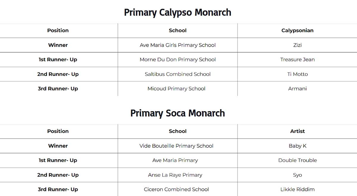 Ave Maria Girls Primary walked away with the Calypso Champions title with their calypsonian Zizi, who is no stranger to the Schools Calypso stage. Baby K from the Vide Bouteille Primary coveted the title for the inaugural National Primary Schools Soca competition.