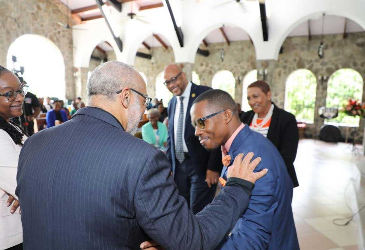 L-R: Dr. Didacus Jules and Pastor Berance pirctured sharing a lighthearted moment at the OECS Thanksgiving Service.