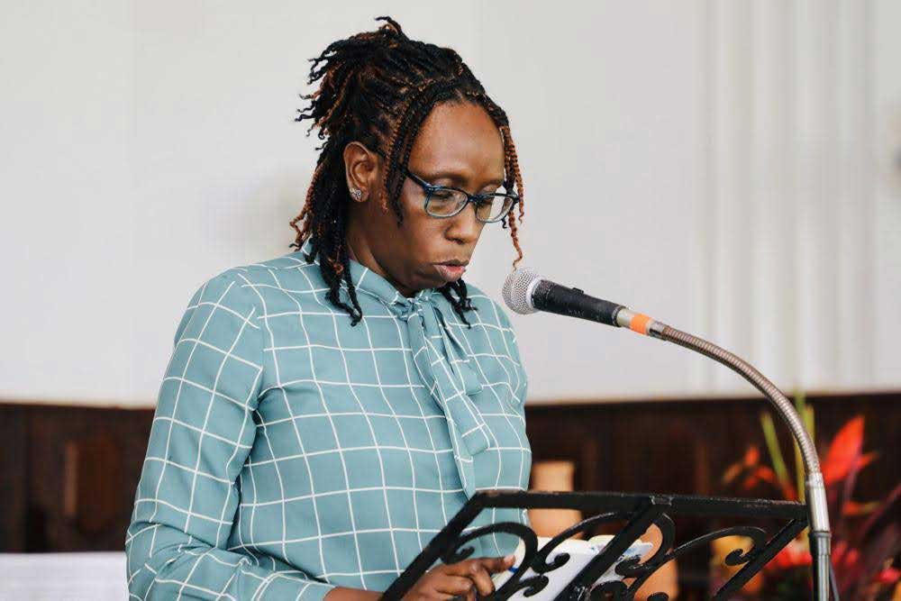 Dr. Kisha Grant, Manager, Office of the Director General, OECS Commission gives welcome remarks at the OECS Thanksgiving Service.