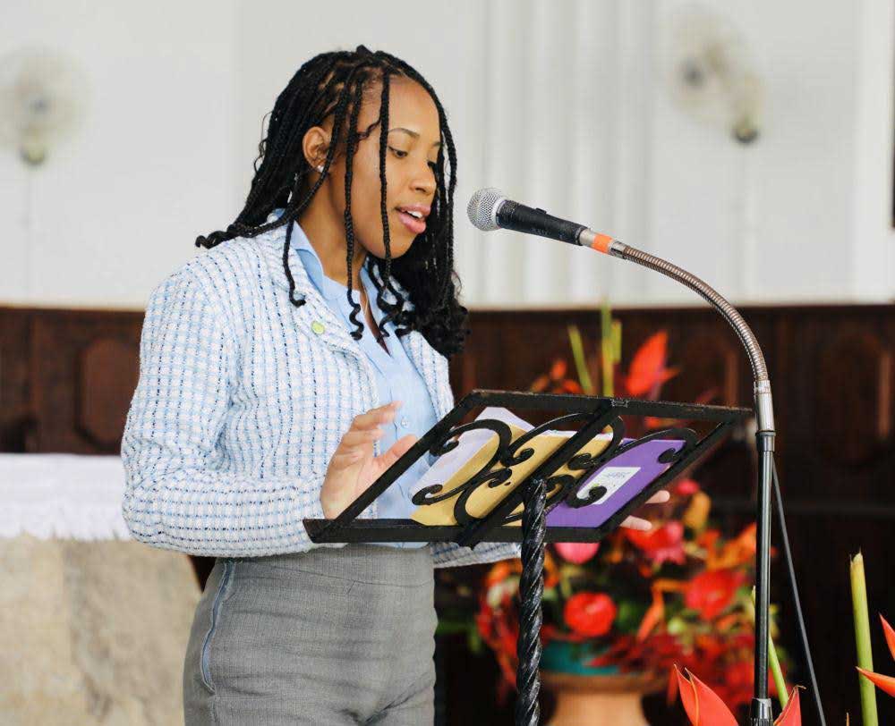 Tamika Sandy leads the congregation in bidding prayers at the OECS Thankgiving Service.