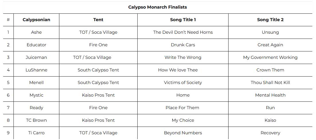 In the semi-final round of the Calypso competition held Sunday, June 18, calypsonians each presented 2 songs. 9 calypsonians were selected to advance to the finals of the Calypso Monarch competition for a chance to dethrone reigning monarch, Dezral.