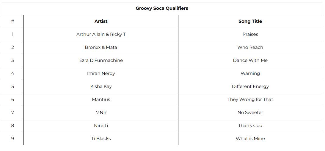 20 songs competed in both the Groovy and Power Soca categories in an effort to make it to the finals of the Soca Monarch competition scheduled for Friday, July 11, 2025. The defending Groovy Soca monarch is Sly, and Power Soca Monarch, Ricky T. The artistes qualifying for the finals are listed below in alphabetical order.