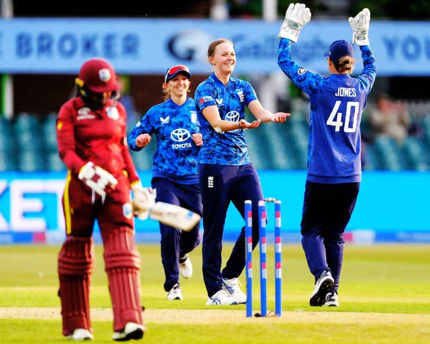 Grimmond seemed unfazed at being asked to open, even when she was struck on the forearm by a ferocious Lauren Filer, who clocked 75mph in her first international match since the Ashes. The young West Indies batter clobbered Lauren Bell for two sixes over the leg side, before finally holing out to long-on in the 23rd over.