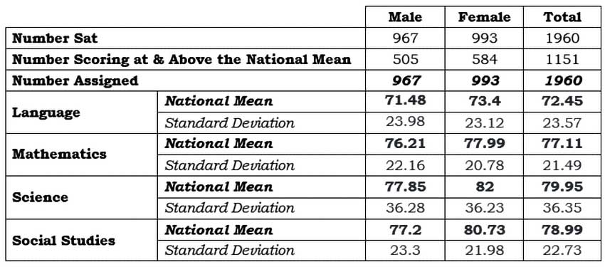 For this year’s examination, the composite scores ranged from 23.6% to 99.6%. The national mean was 77.24% representing an increase of 0.16% when compared to 77.08% in 2024. One thousand eighty-nine (1089) or 55.56% of the candidates scored at or above the national mean, while eight hundred and seventy-one (871) or 44.44% scored below the mean. One thousand nine hundred and eighty-three (1955) candidates were assigned to twenty-one secondary schools and five (5) opted to attend private schools.