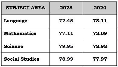 When compared to 2024, there was an increase in performance in Mathematics, Science and Social Studies. Science recorded the highest performance of 79.95%. While there was an increase of 4.02% in Mathematics performance, there was a decrease of 5.66% in Language performance.