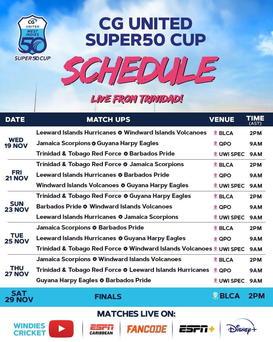 Matches at BLCA will be broadcast live on ESPN Caribbean, ESPN+, Disney+ and Fancode (India), while matches at QPO and UWI SPEC will be streamed live with commentary on the Windies Cricket YouTube channel.