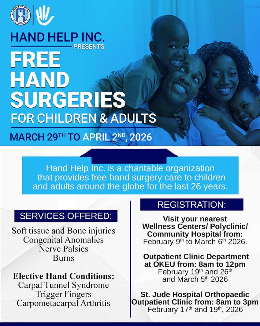 The Ministry of Health, Wellness and Nutrition in collaboration with Hand Help Inc. will be hosting the second Hand Surgery Mission in Saint Lucia from March 29th -April 2nd, 2026. The Mission will be housed at the Millennium Heights Medical Complex and the St. Jude Hospital.