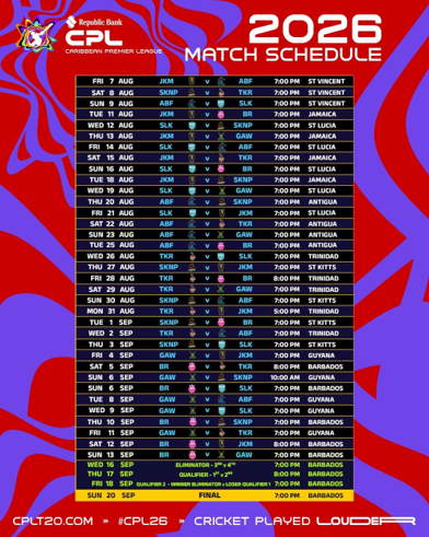 The Republic Bank Caribbean Premier League (CPL) has officially unveiled the fixtures for the 2026 season, with 39 matches set to take place from 7 August to 20 September.