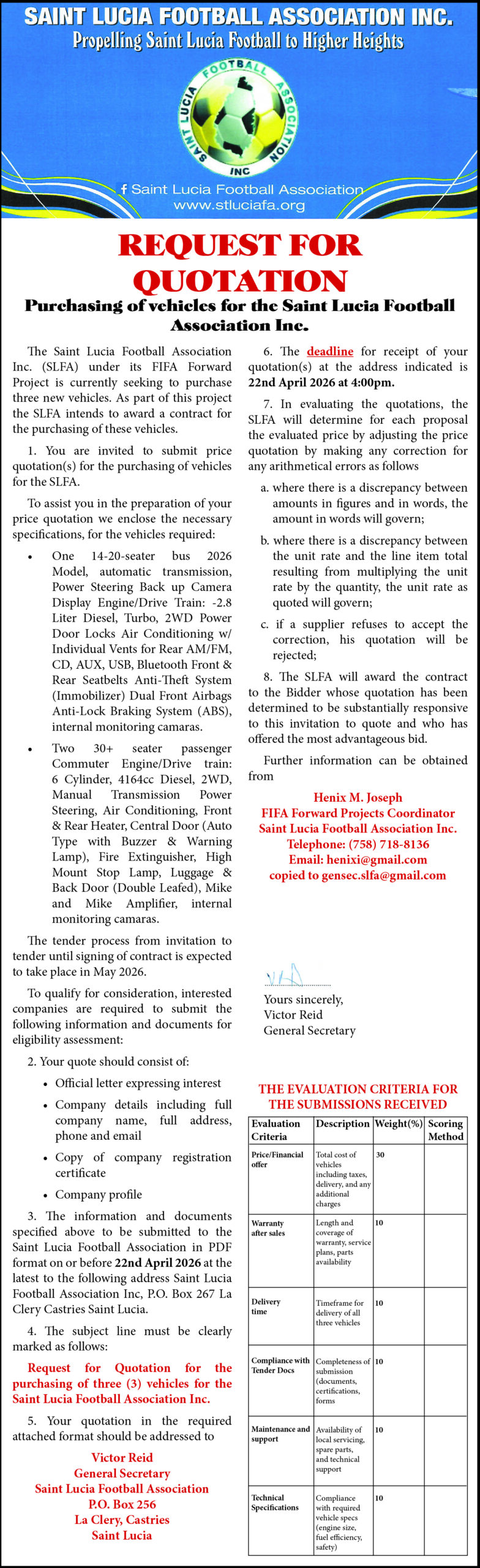 Notice, Vacancy REQUEST FOR QUOTATION – Purchasing of vehicles for the Saint Lucia Football Association Inc. VP DigitalApril 9, 2026 8:04 amApril 10, 20260 Share Facebook Twitter LinkedIn WhatsApp Facebook Messenger Email Share Facebook Twitter LinkedIn WhatsApp Facebook Messenger Email