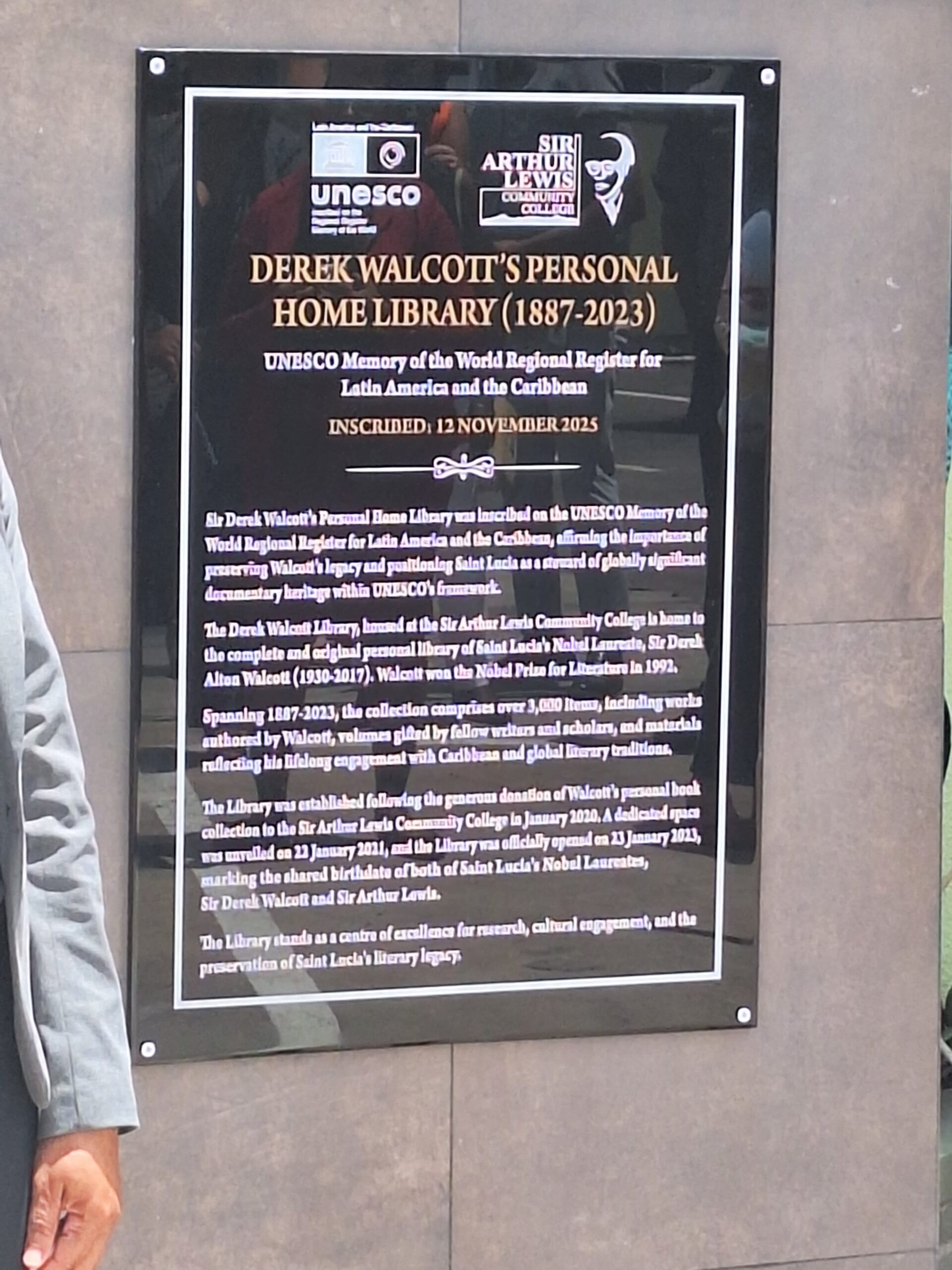 The Sir Arthur Lewis Community College (SALCC) in collaboration with the St. Lucia National Commission for UNESCO, this week unveiled a commemorative plaque on the inscription of the Derek Walcott Library on UNESCO’s Memory of the World Regional Register.