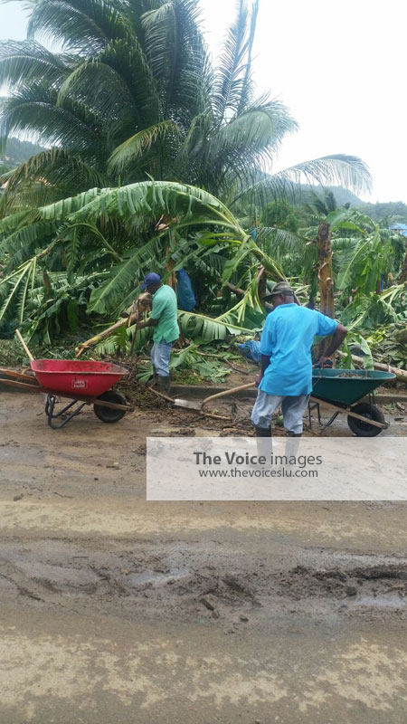 As soon as the all clear was given, residents quickly put on their water boots, grabbed their shovels, cutlasses and wheelbarrows and began clearing the debris left by the storm. Clean up crews tackled the bridges in Cardi and Derniere Riviere and also the Thomazo Bridge.