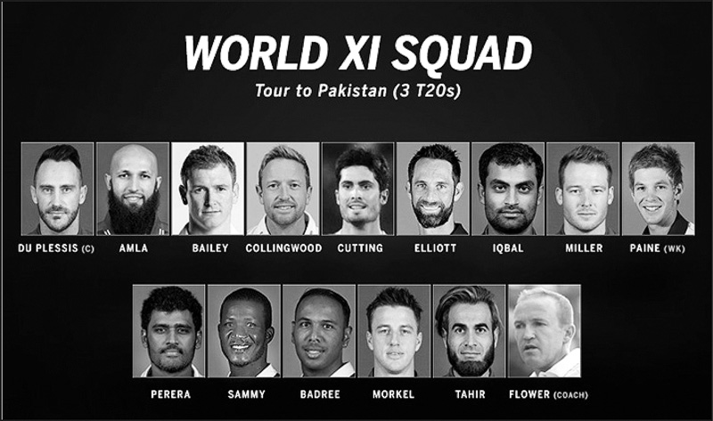 The World XI squad reads: Faf du Plessis (captain), Hashim Amla, Samuel Badree, George Bailey, Paul Collingwood, Ben Cutting, Grant Elliott, Tamim Iqbal, David Miller, Morne Morkel, Tim Paine, Thisara Perera, Imran Tahir and Daren Sammy.
