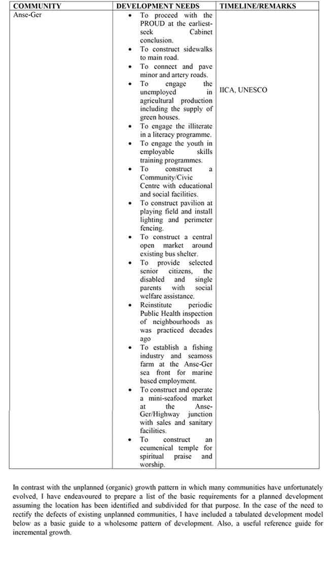 The spirit of this subject charter is particularly relevant to the needs of depressed areas of the Micoud South Constituency, like the Anse-Ger community, and should appeal significantly to the current parliamentary representative who incidentally is also the current Prime Minister. Anse-Ger cannot, therefore, miss the best opportunity for parliamentary attention to eradicate their anti-progressive, poverty-stricken tradition within that community.