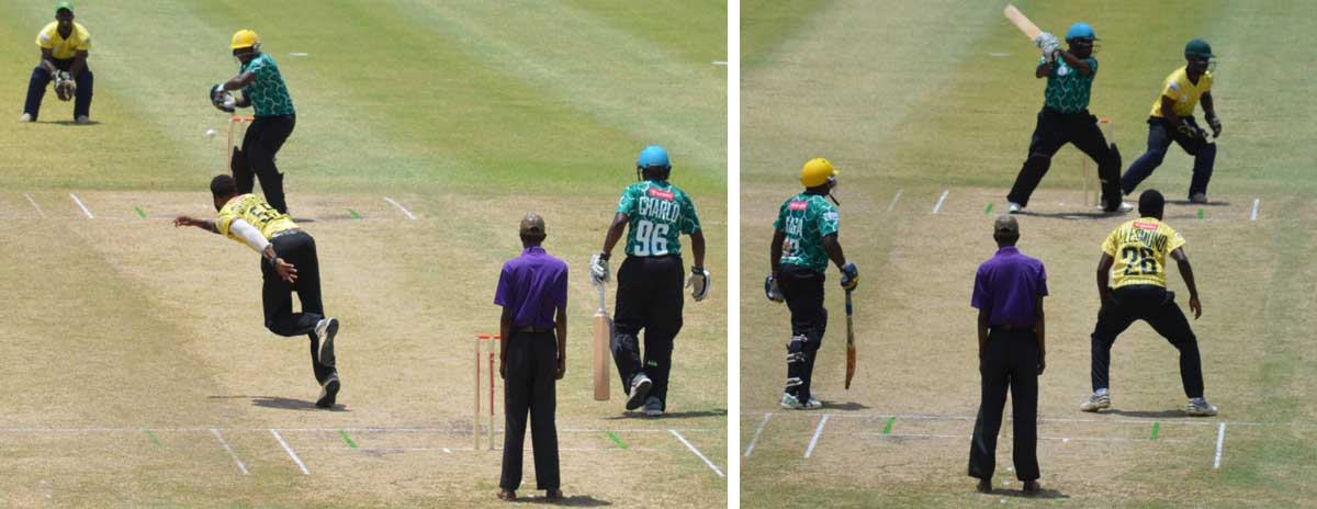 (L-R) Daren Sammy (Micoud Eagles) bowls a delivery to Craig Emmanuel (Mon Repos Stars); Audy Alexander (CCP) picked up 1 for 13; the Sammy brothers, Lanse, Daren and Murlan were in action yesterday against Choiseul Coal Pots. (PHOTO: Anthony De Beauville)
