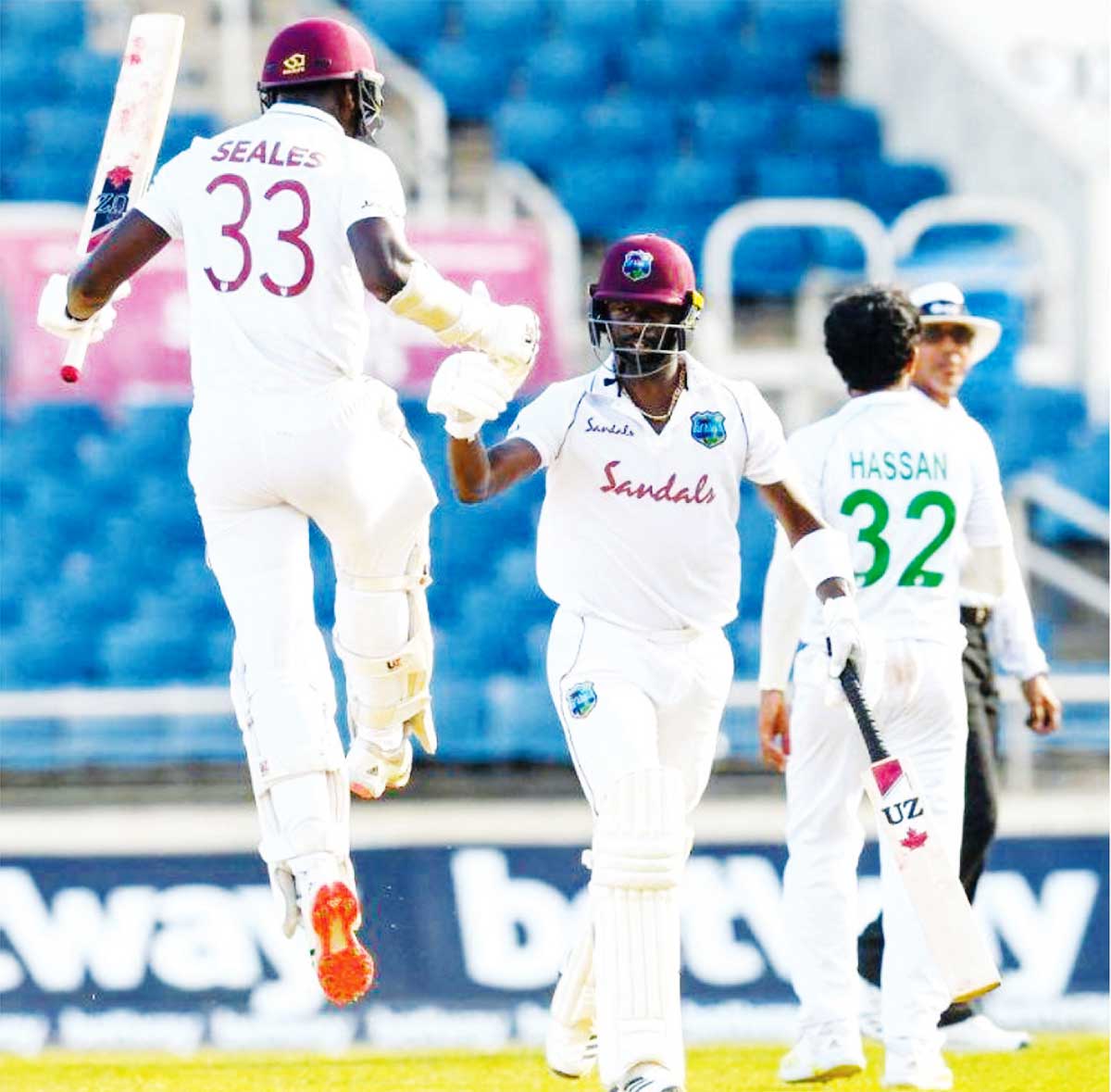 The No. 9 Roach and No. 11 Seales held their nerves to take West Indies to victory, with Roach hitting the winning runs to finish unbeaten on 30 from 52 balls which included 2 fours and Seales with 2 from 13 deliveries.