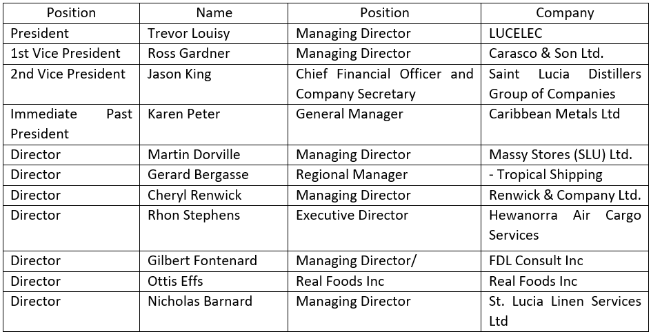 The 2021/2022 Board of Directors of the St. Lucia Chamber of Commerce Industry and Agriculture are: